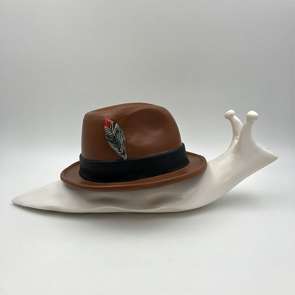 These hand-sculpted Snails are glazed in satin white and topped with a fanciful hat instead of their typical shell. Choose from a dapper looking Top Hat, which we like to call “Putt’n on the Ritz”, a “SteamPunk” Top Hat with Goggles, to a Knit stocking cap, a four color Beanie with Propeller, Fedora we’re calling absolutely “Fedorable” and “BrunHilda” complete with horned helmet and a pair of trailing blonde braids.